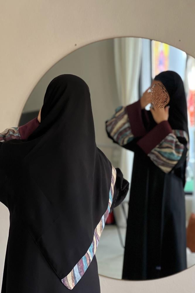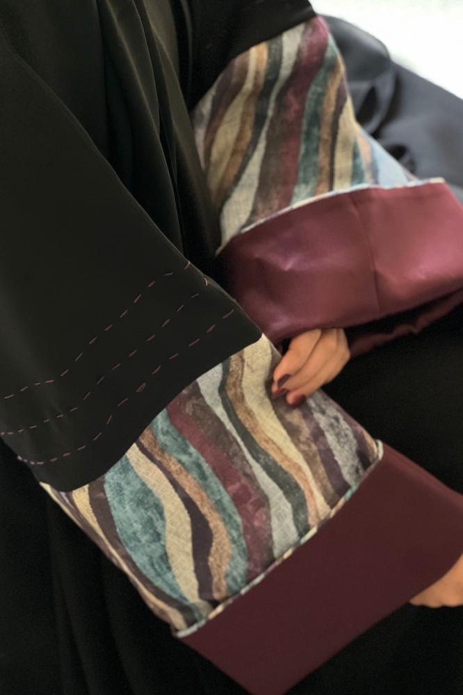 - عباية مكونه من قماش اللمار والتفته الساده وقماش المشجر والتطريز